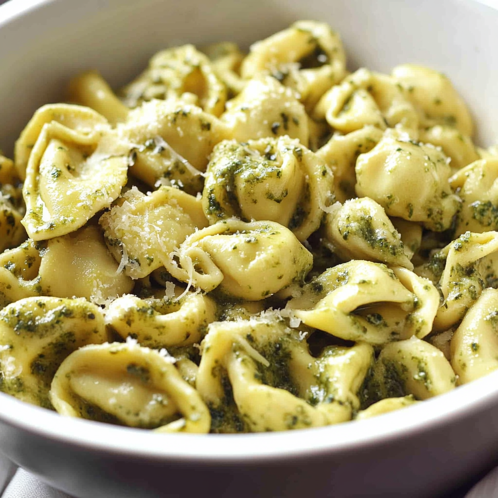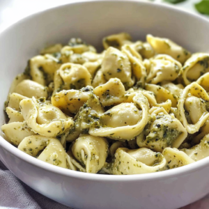 Pesto tortellini is a delicious pasta dish made by tossing cheese-filled tortellini with fresh basil pesto, often complemented by spinach and grated cheese.